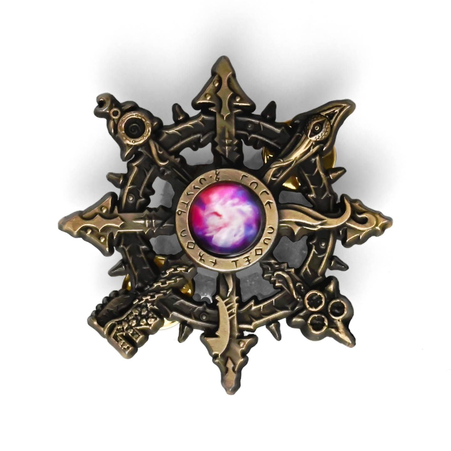 The maddening allure of the Warp takes physical form in this 5 cm Mark of Chaos pin—an intricate tribute to the gods of ruin from the universe of Warhammer 40,000. Worn by champions of the Dark Gods, this pin captures the unholy fusion of power, ambition, and damnation. At its center, a swirling vortex of pink and violet evokes the shifting energies of the Immaterium, framed by a daemonic star crowned in ornate, corrupted bronze—each point teeming with twisted detail, from leering eyes to runic inscriptions.
